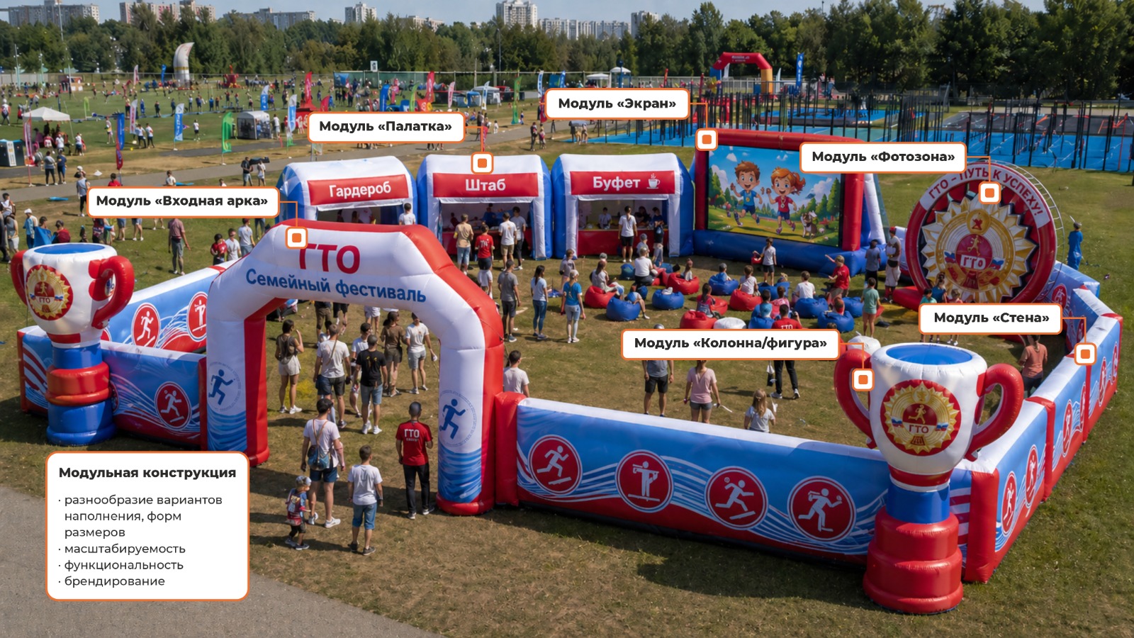 К периметру можно добавить палатки, фотозоны, зоны отдыха, мобильный надувной экран и другие модули. Формат легко адаптируется под задачу, тему мероприятия и размер площадки.