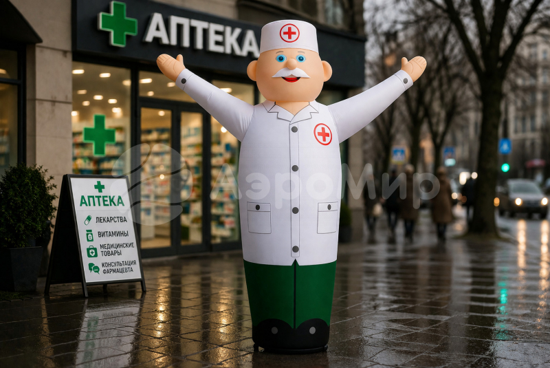 Аэромен Доктор, Врач, Аптекарь, с машущей рукой. Замечательная динамичная реклама. Прекрасно прорекламирует Вашу торговую точку или место оказания медицинских услуг, пункт медицинской помощи. Такая реклама заметна, и в всегда привлекает к себе массу внимания. Зазывающие движения рук человечка, одетого в спец форму с нанесение логотипа или Вашего бренда - оригинальная фигура, которая будет только у Вас, а встроенная подсветка сделает ее заметной даже в темное время суток.