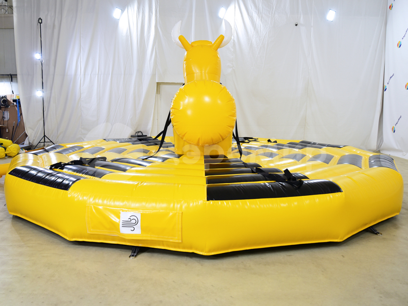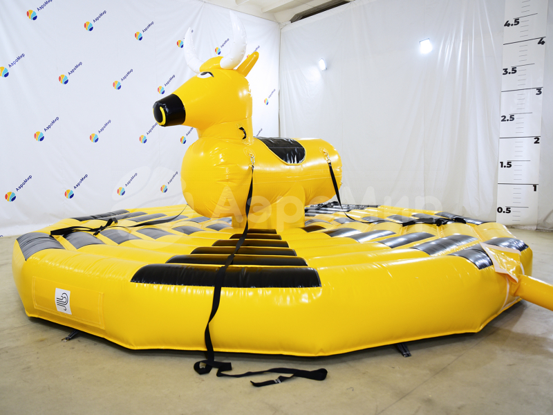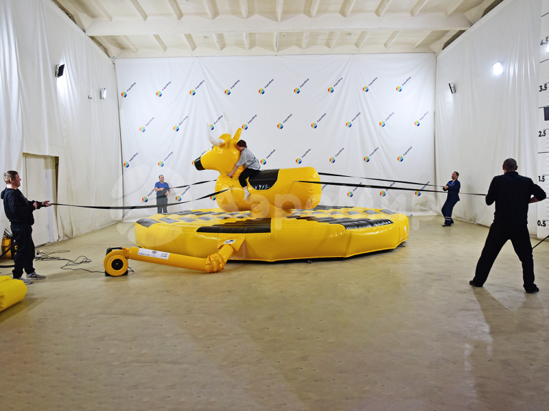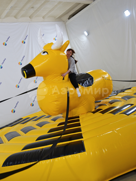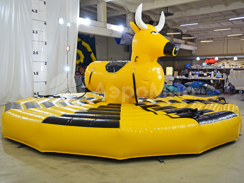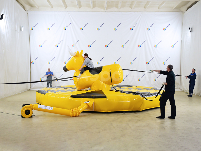 Надувной аттракцион родео на быке — экстремальная забава для любителей острых ощущений, готовых испытать на прочность нервы и запредельную ловкость. Удержаться на качающемся бешеном быке — не легкая задача, когда его с 4-х сторон раскачивают, то влево, то вправо, то вперед, то назад. Организация игры: один участник садится на быка, а четверо добровольцев раскачивают аттракцион за веревки. Цель игрока одна — остаться в седле, продержавшись отведенное время.