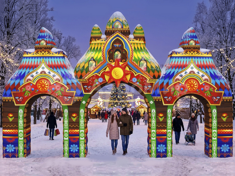 Терем расписной — надувная арка для оформления мероприятий в русском народном стиле. Преобразите общественное пространство на День города и Масленицу! Привлекайте гостей на тематические праздники и ярмарки, потешные представления и подвижные конкурсы. Сказочный терем с трёмя пёстрыми башенками будет виден издалека!