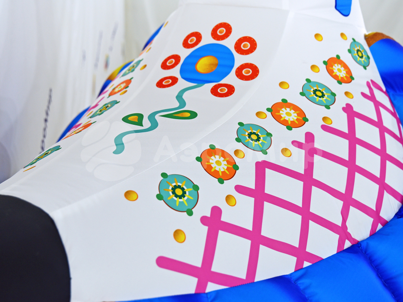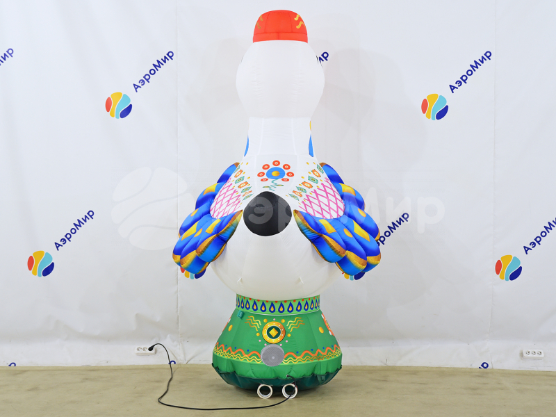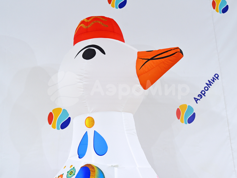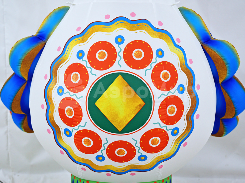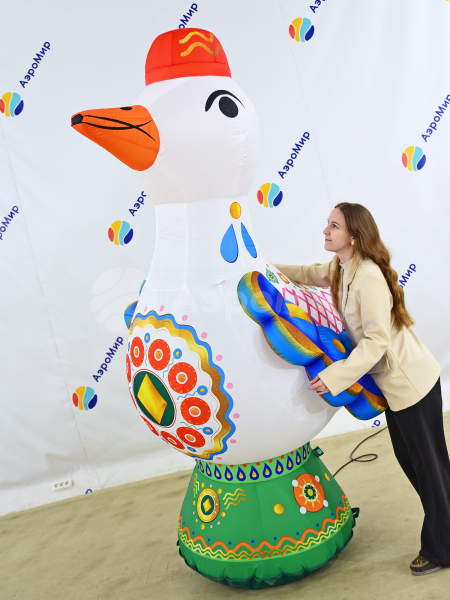 Уточка — надувная фигура в стиле дымковской игрушки. Эффектно обозначит вход на праздник или ярмарку. Украсит дом культуры, театр, музей, библиотеку, ресторан или кафе. Заметная декорация подойдёт для оформления улицы и больших помещений на Масленицу. Можно дополнить фигуру подсветкой и разместить на ней рекламную информацию.
