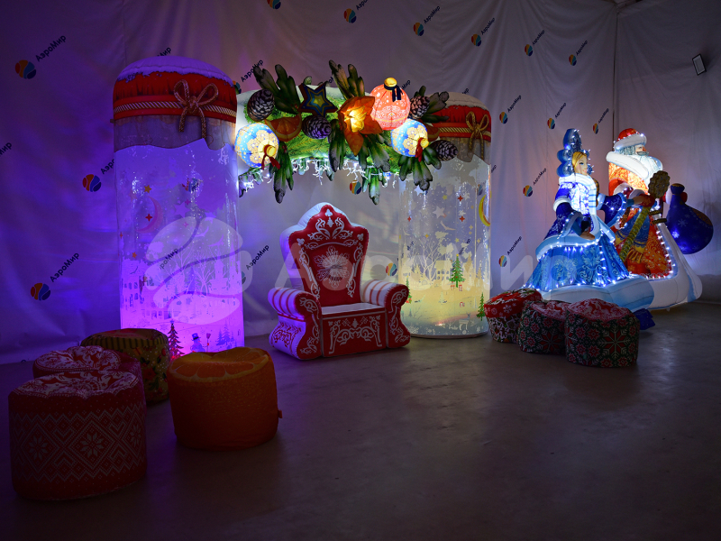 Фото реализованных новогодних надувных фигур: Дед Мороз, Снегурочка, Елки, Снеговики, праздничные фотозоны