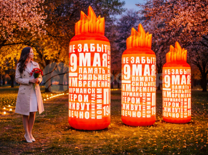 Чтобы подчеркнуть атмосферу праздника, безусловно, требуются символы победы. Поэтому, мы реализовали комплексное оформление. В нашем каталоге: надувные фигуры и техника времен великой отечественной войны, имитация «вечного огня», торжественные сцены для выступлений и поздравлений, арки для входной зоны, большие шары, надувные стенды со звездой и различными украшениями, и наконец, яркие и реалистичные надувные цветы.