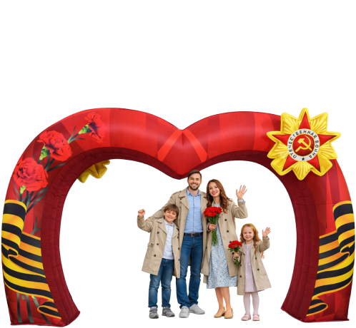 Надувные арки на День Победы — выразительное и торжественное решение для оформления городских площадей, парков и общественных пространств. Они акцентируют входную группу, создают ощущение значимости события, формируют целостную праздничную атмосферу, поддерживают стилистику сцены и всей площадки любого масштаба. Тематическая надувная арка может обозначить главный вход или стать эффектной фотозоной для гостей.