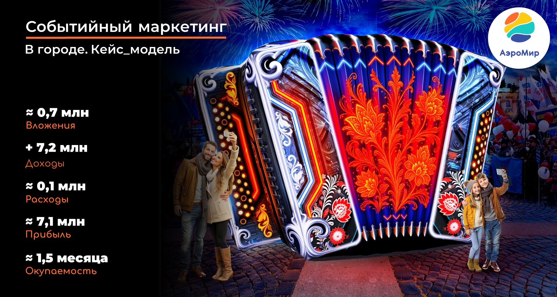 Компания «АэроМир» уже более 17 лет работает в этой сфере и показывает на реальных примерах, как надувные конструкции помогают привлекать гостей и зарабатывать. Такие решения быстро устанавливаются, подходят для разных форматов событий и используются много раз в течение года.